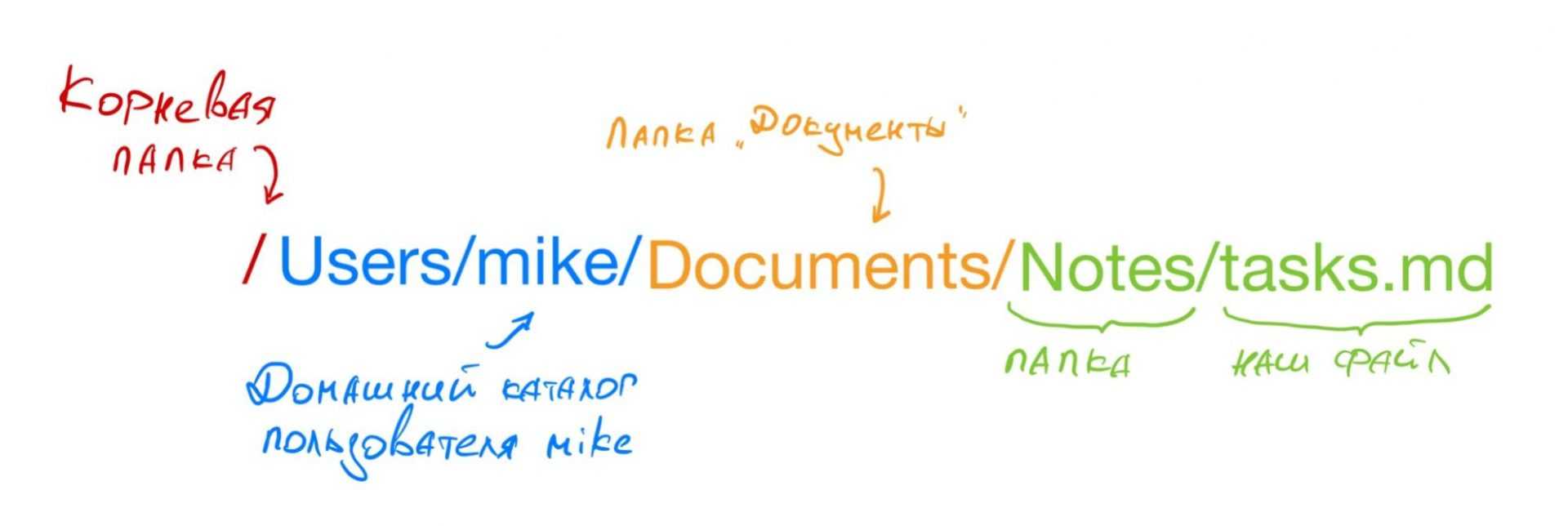 Ещё одно отличие MacOS и Linux в том, что вместо обратной косой черты используется просто косая черта, у которой наклон в другую сторону: /. Всё остальное работает по тому же принципу: в абсолютном пути мы собираем все папки, которые нужно пройти, начиная с корня.