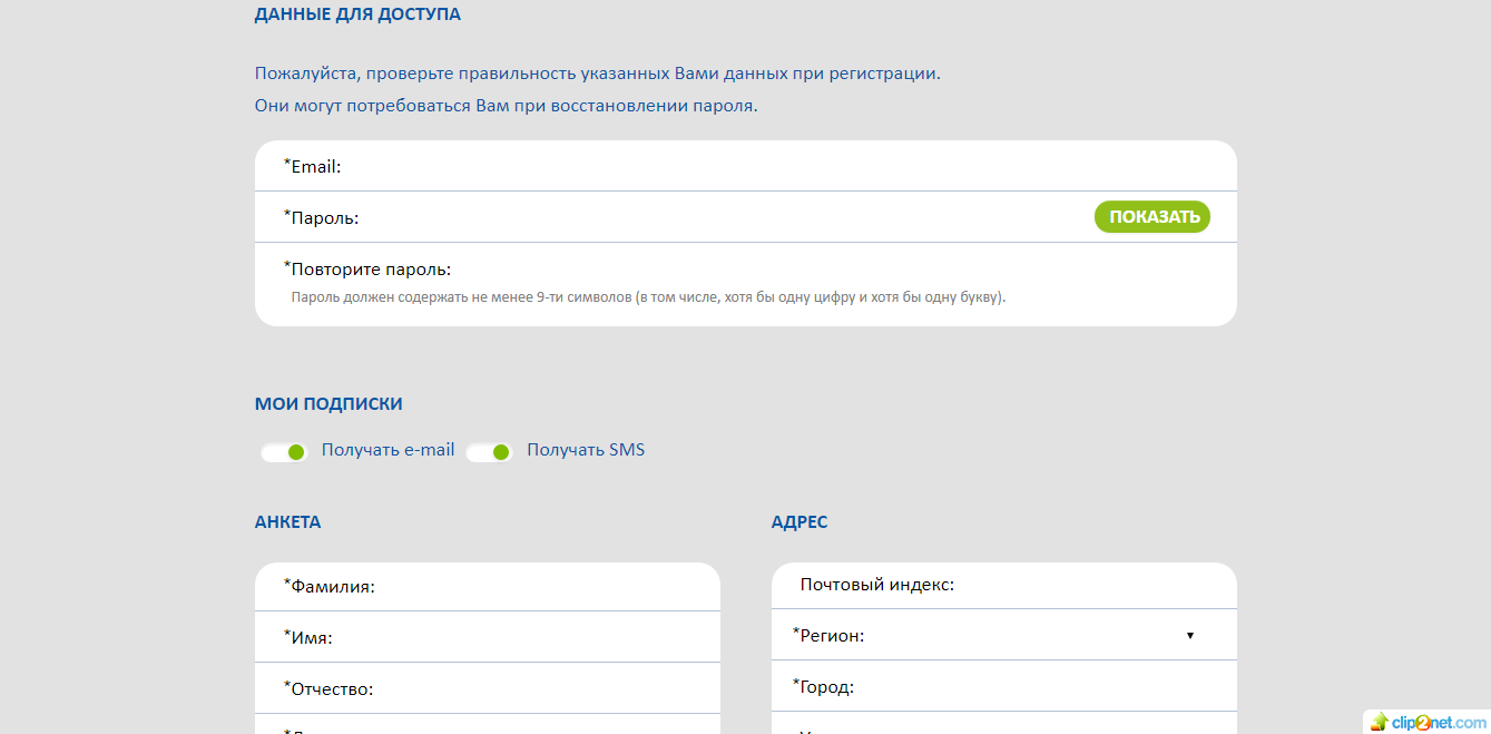 - Пароль для личного кабинета (подумайте об этом заранее, пароль должен отвечать требованиям сайта).