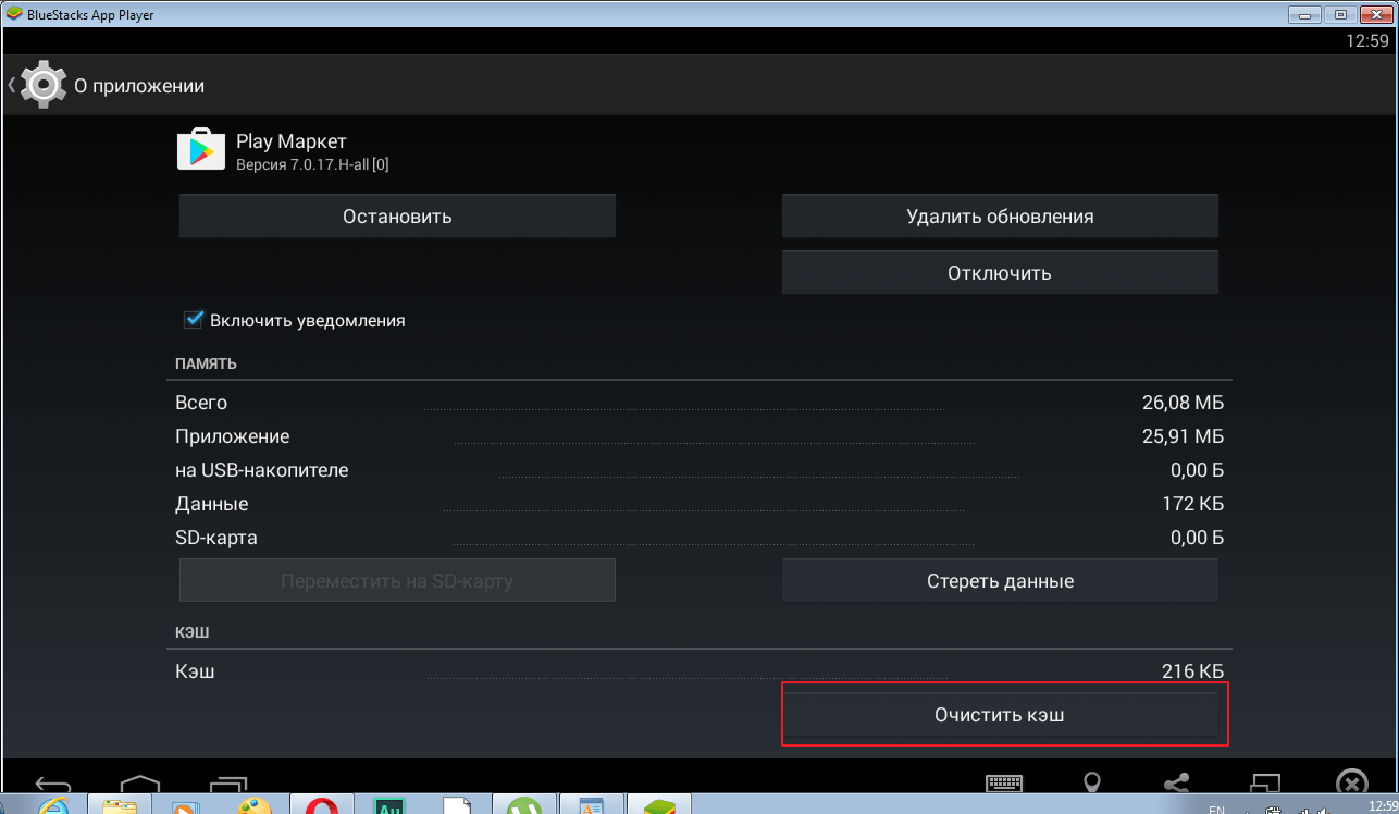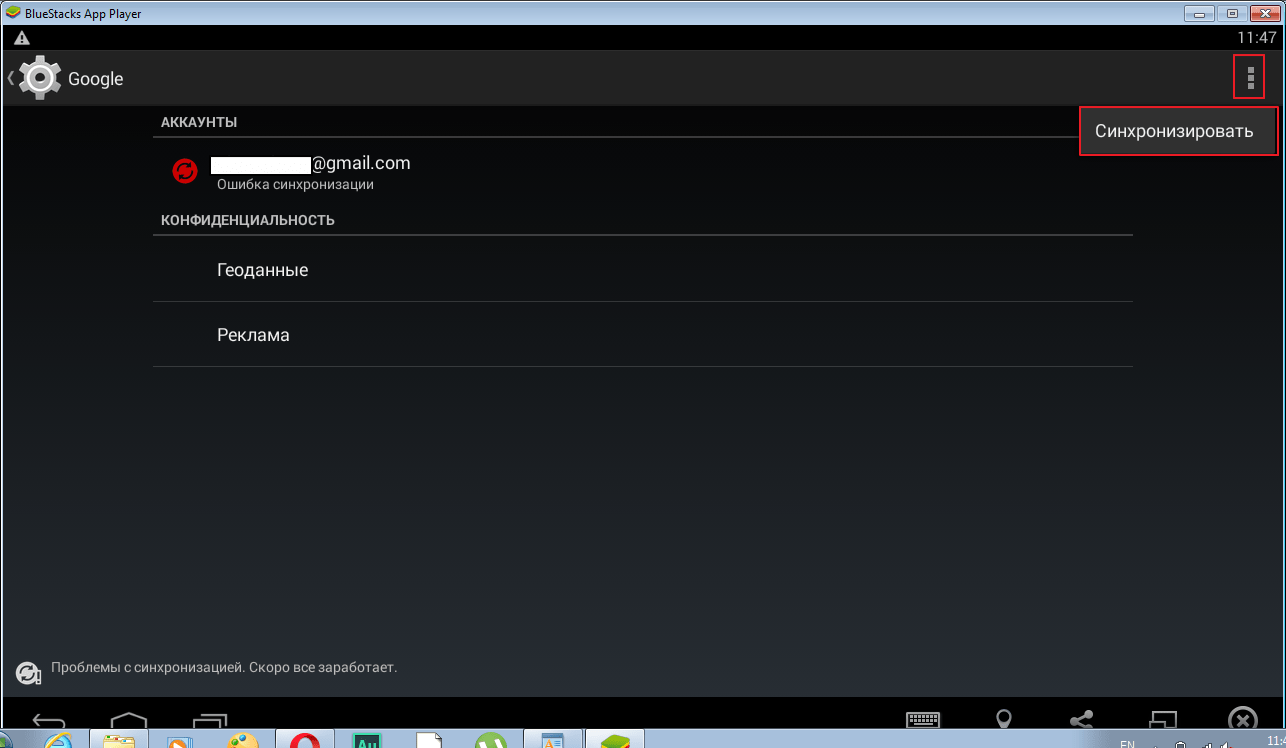 . Снимаем галочки в синхронизации и перезапускаем BlueStacks.