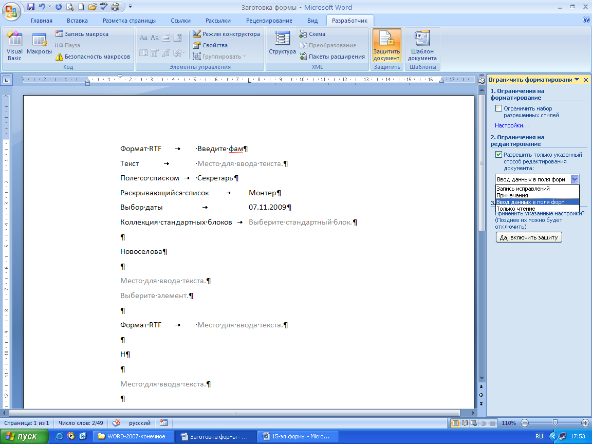 Введите ограничение на доступ к будущему шаблону командой РАЗРАБОТЧИК – группа Защитить – Защитить документ. В появившейся Области задач — Ограничить форматирование в группе Ограничение на редактирование выбрать из списка Ввод данных в поля форм. Далее укажите Да, включить защиту (пароль не вводите).