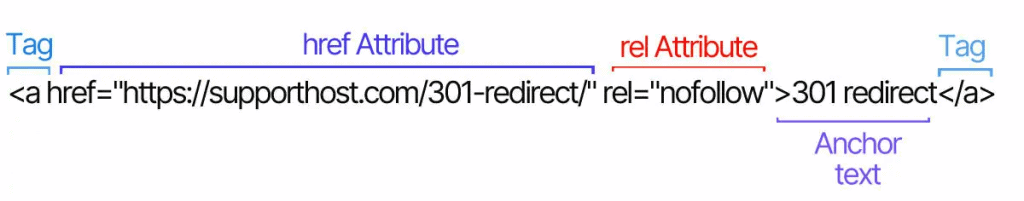 Here the structure of the <a> tag used for links is shown. In this example, a rel nofollow attribute has been inserted.