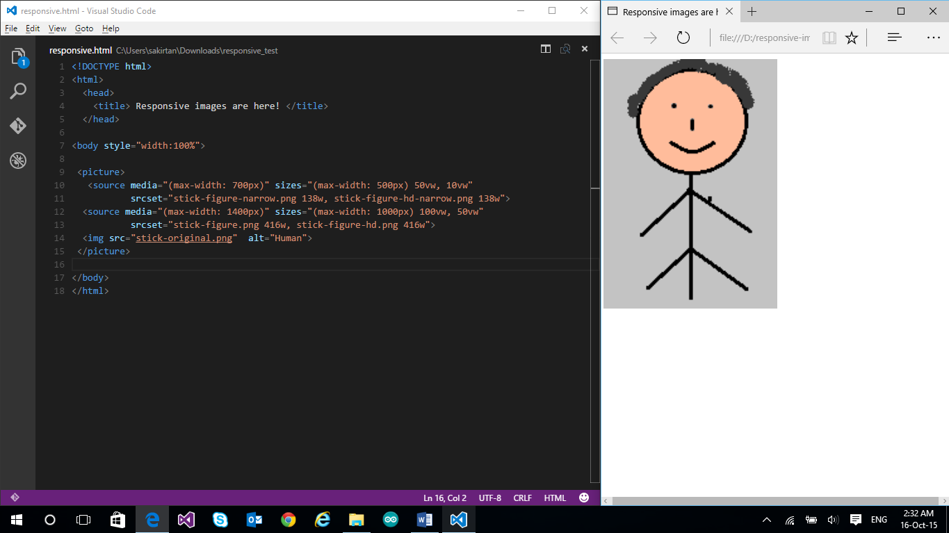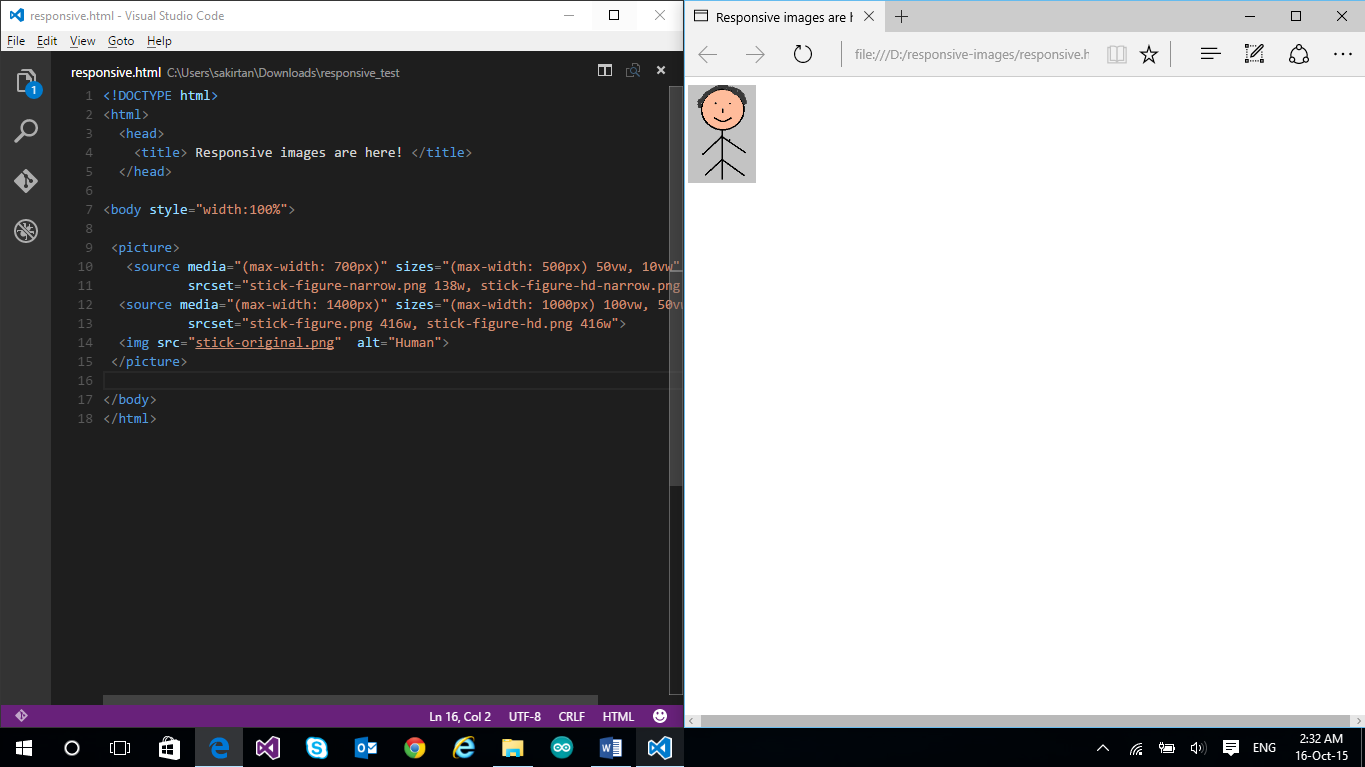 Similarly, the second element is chosen if the max width is 1400px (which means now the width ranges from 701px to 1400px). The attribute ensures that if the viewport width ranges from 701px to 1000px, the image’s width is same as the viewport width, and if the viewport width ranges from 1001px to 1400px, the image occupies half of the viewport width. To verify all the cases, I simply resize the browser and check. In real-world use, your website will be accessed through different devices and that is where you’ll see the actual use of responsive images. Here is the output: