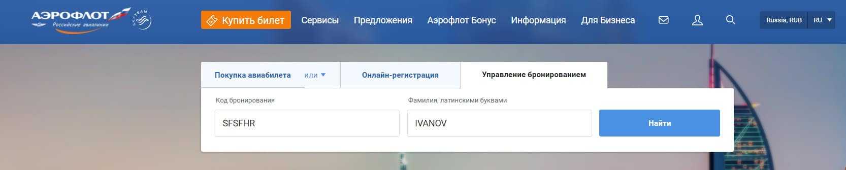 Заполняйте поля «Код бронирования» и «Фамилия латиницей» и нажмите кнопку «Найти».
