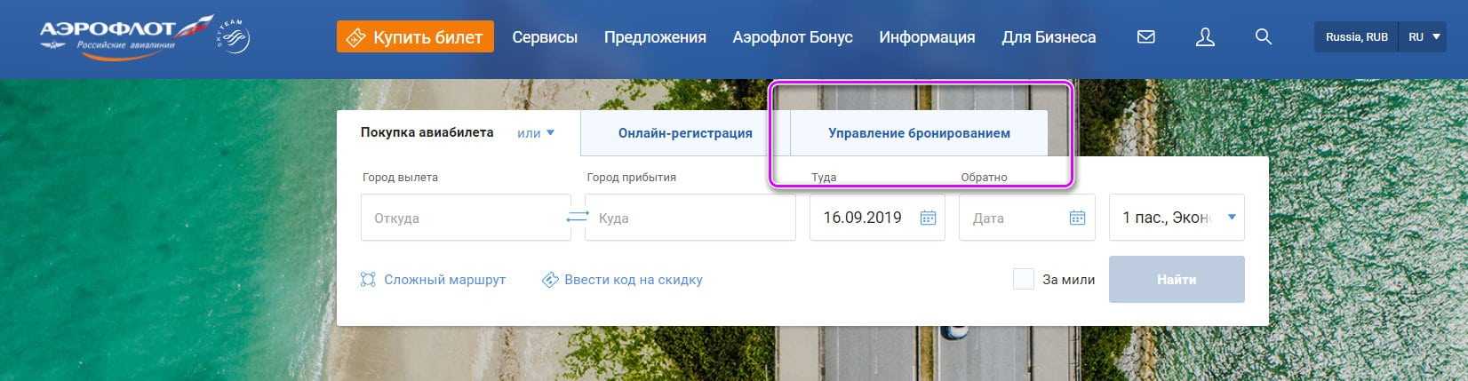Проверить бронь электронного билета можно на сайте «Аэрофлота». Для этого вам нужно найти вкладку «Управление бронированием» в разделе «Онлайн-сервисы» или перейти по этой ссылке.