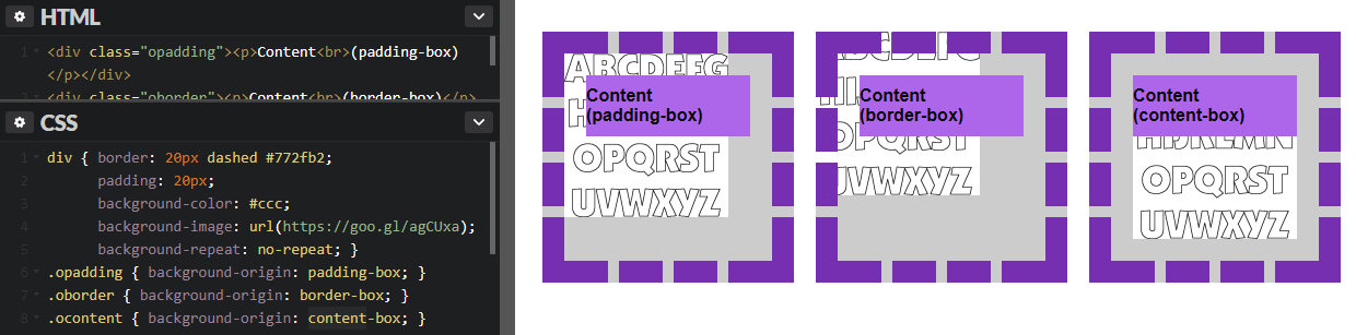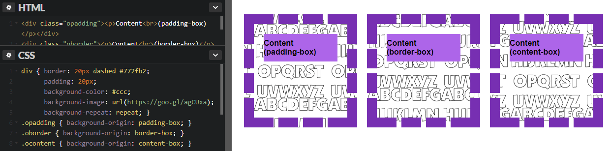 - background-origin: specifies the origin position of the image that can start from the upper left corner of the padding edge (padding-box), of the border (border-box) or of the content (content-box)
