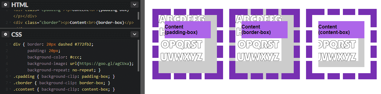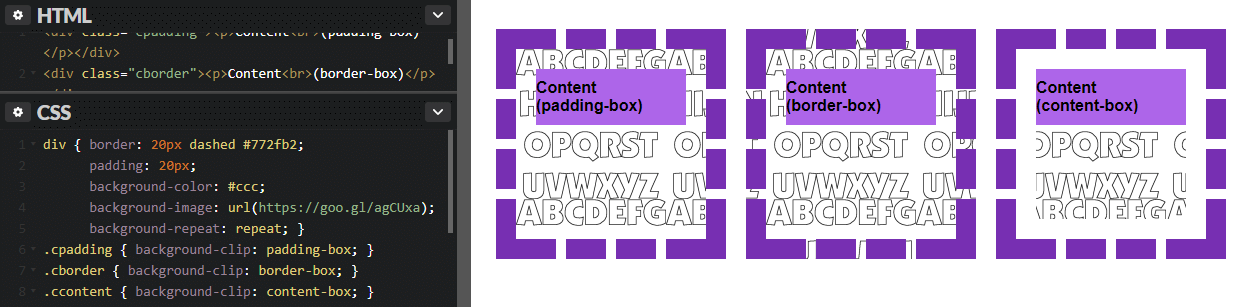 The property also accepts a keyword that clips the background to be no further than the text within the content box. For this effect to be evident in the actual text within a CSS box, the text must be partially or completely transparent.