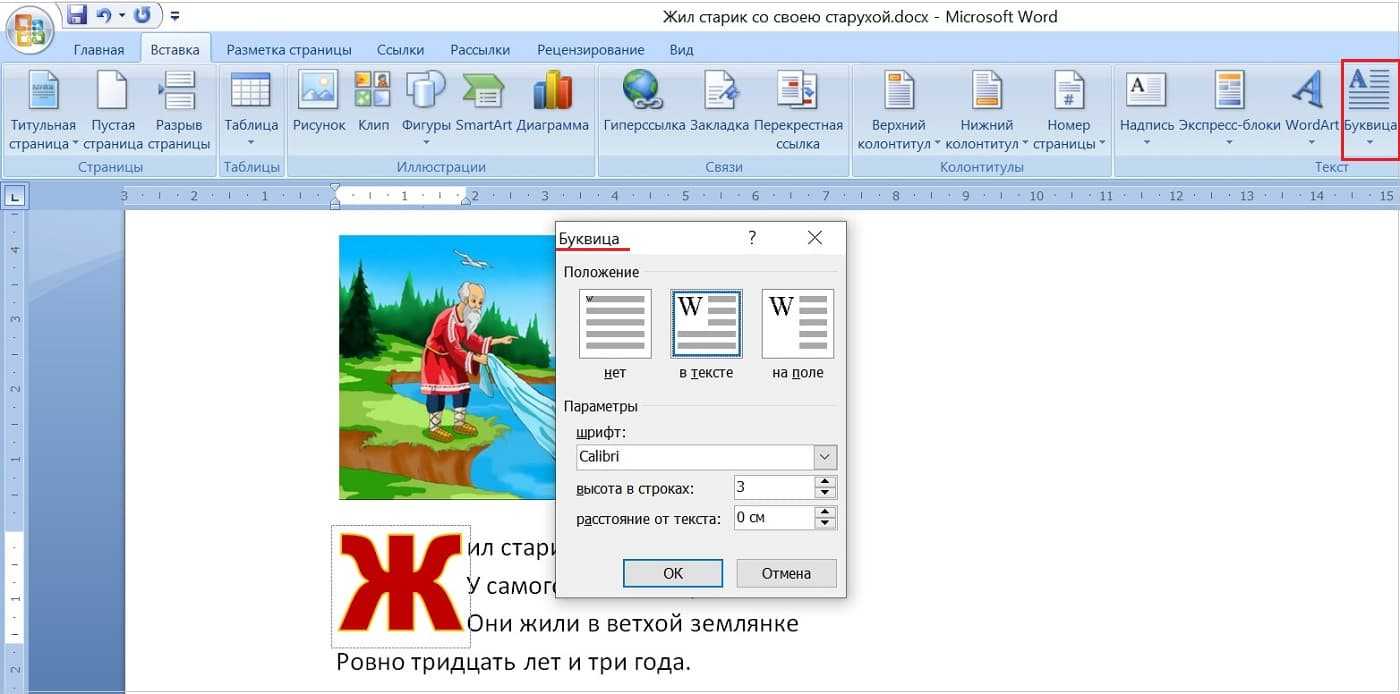 Как сделать буквицу в Word – Окно Буквица в ворде