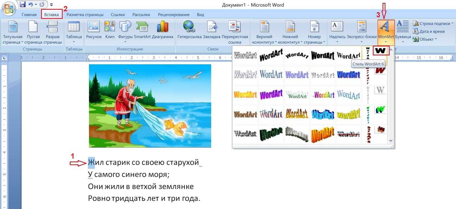 В верхнем меню Ворда имеется вкладка «Вставка» (2 на рис. 1). Там есть WordArt (3 на рис. 1), в котором можно выбрать любой стиль, например, WordArt 6.