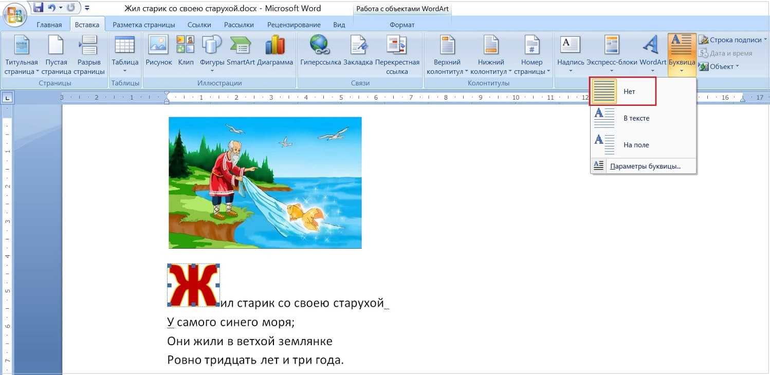 Как изменить расположение буквицы в абзаце? В меню «Вставка», рядом с «WordArt» есть еще «Буквица». Кликаем на «буквица». На рис. 4 показан формат «Нет» и как выглядит расположение буквицы при этом формате.