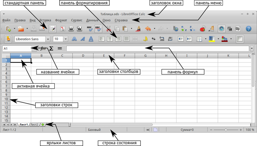 После запуска Calc появляется главное окно программы, которое показано на рисунке ниже.