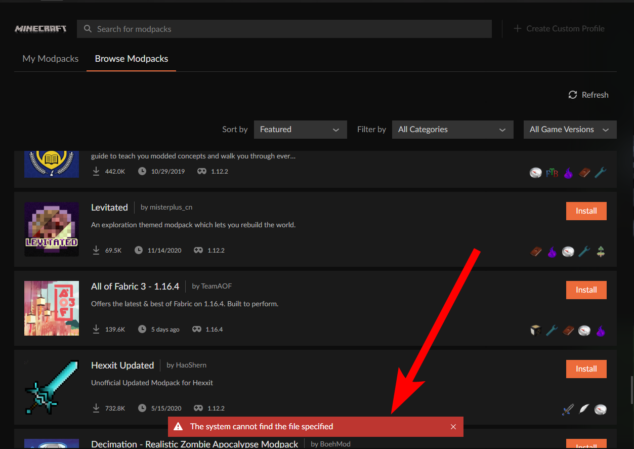 If you’re trying to launch modpacks but nothing is happening, or the error message «The System cannot find the file Specified» shows up, please try the following solutions: