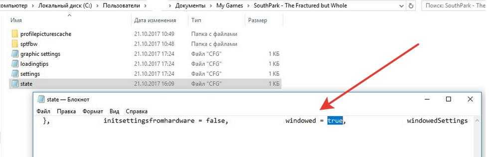 Открываем папку с документами на диске C: Документы(Documents)\Пользователи(Users)\Имя пользователя\My Games и в папке SouthPark — The Fractured but Whole находим файл с опциями state.cfg.