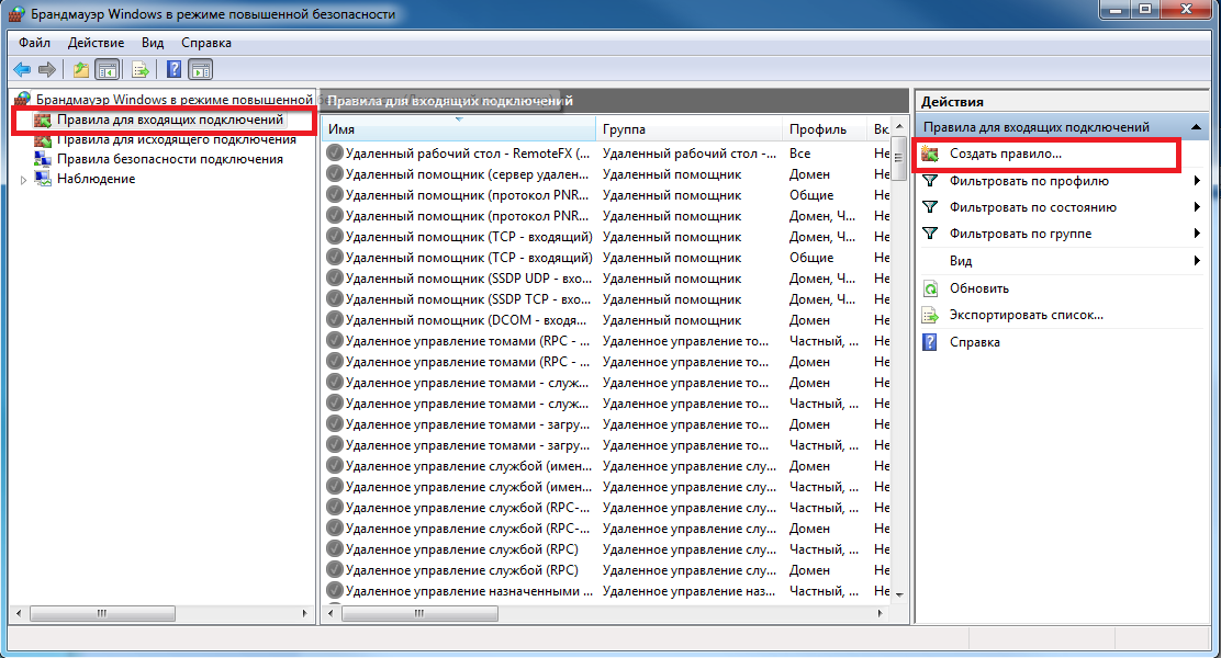 - Далее перейдите в «Правила для входящих подключений» и кликните там «Создать правило».