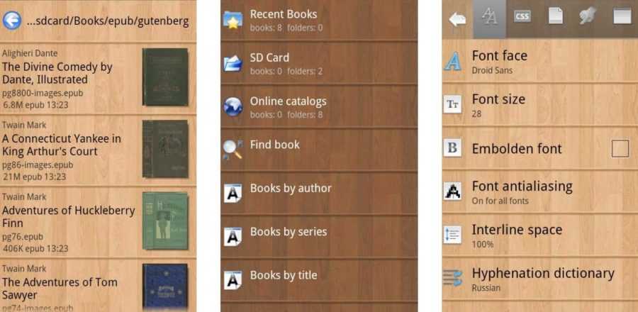 Cool Reader – культовая читалка с архаичным, но приближенным к бумажным носителям интерфейсом. Визуальные сходства с книгами действительно несложно сразу же заметить – в каждом меню пожелтевшие страницы с ровными рядами букв и символов. Но привыкать к подобной обстановке необязательно – Cool Reader не мешает выбрать тему с более выдержанными цветами или же и вовсе загрузить собственную фоновую иллюстрацию.