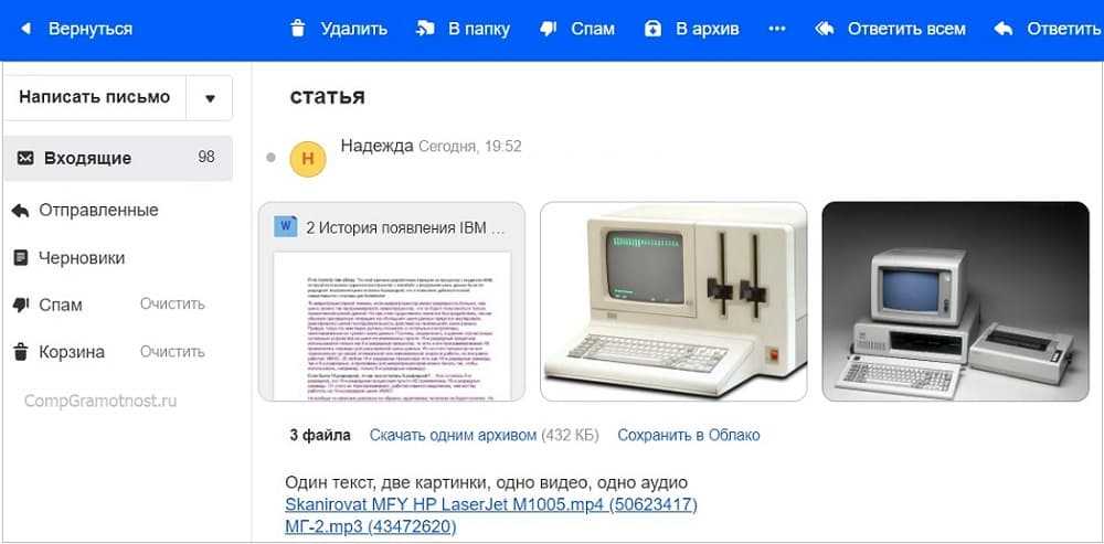 На рисунке 4 можно увидеть, что прямо к письму прикреплены две картинки и один текст, а на файл с видео в письме есть синяя ссылка: Skanirovat MFY HP LaserJet M1005.mp4 (50623417), на файл с аудио дана вторая синяя ссылка: МГ-2.mp3 (43472620).