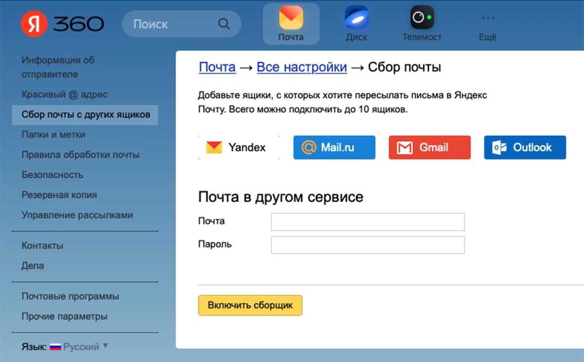Тем, кто не хочет дополнительно настраивать учётку или привязывать к ней телефонный номер и при этом использует почтовый ящик в другом сервисе, рекомендуем настроить автоматический сбор почты.