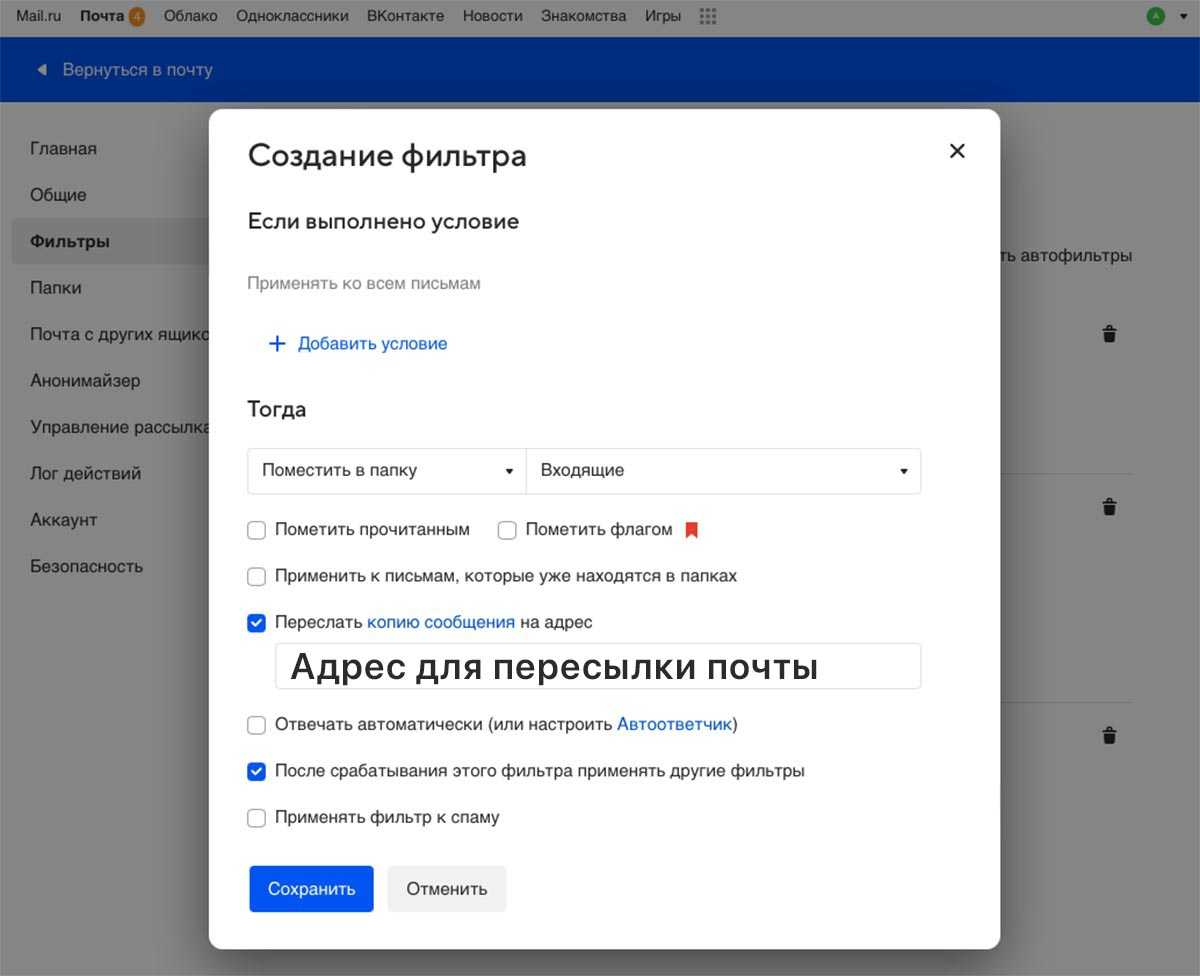 Если же вы хотите собирать почту в сервисе iCloud, который не имеет встроенных механизмов по сбору писем из других ящиков, тогда нужно настроить пересылку в учётке Mail.ru.