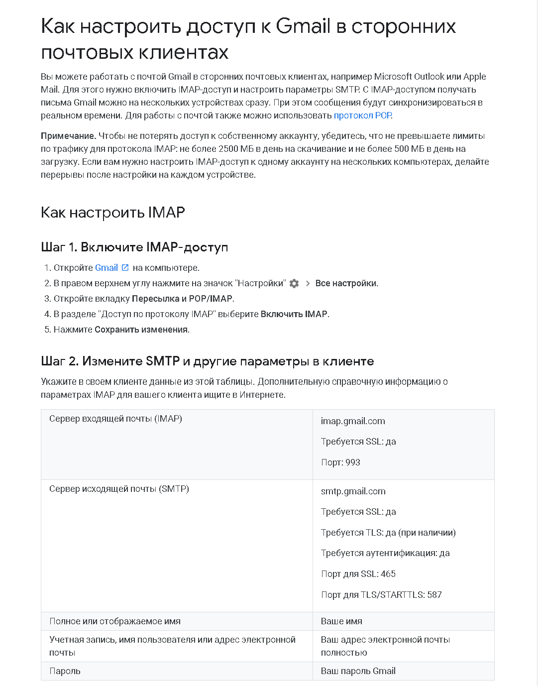 Далее последовательность действий такая же, как при подключении почты Яндекс. Параметры для настройки IMAP-соединения указаны на сайте Гугл.