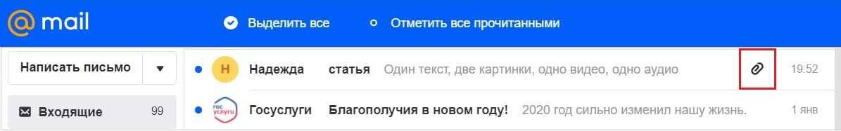 Независимо от количества файлов, которые , внешне такое письмо имеет такой вид, как представлен на рисунке 3. Значок в виде скрепки напротив письма указывает на наличие вложенных файлов: одного или нескольких.