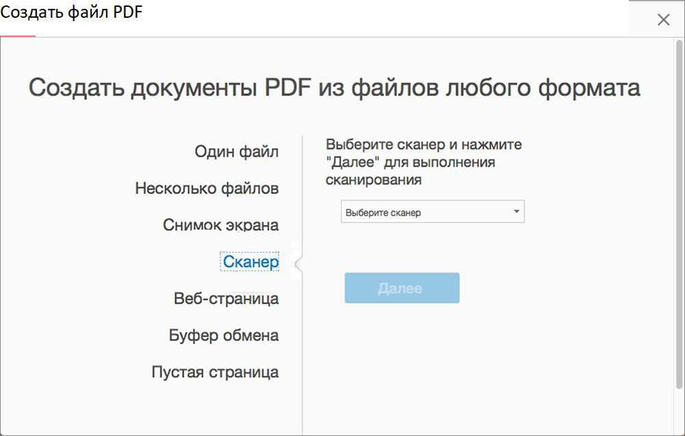 Формат PDF бумажного документа создается при выборе «Создать файл PDF» на вкладке «Инструменты». Затем появится интерфейс «Создать PDF-файл из любого формата файла», в котором надо выбрать элемент «Сканер», чтобы отобразить доступные параметры.