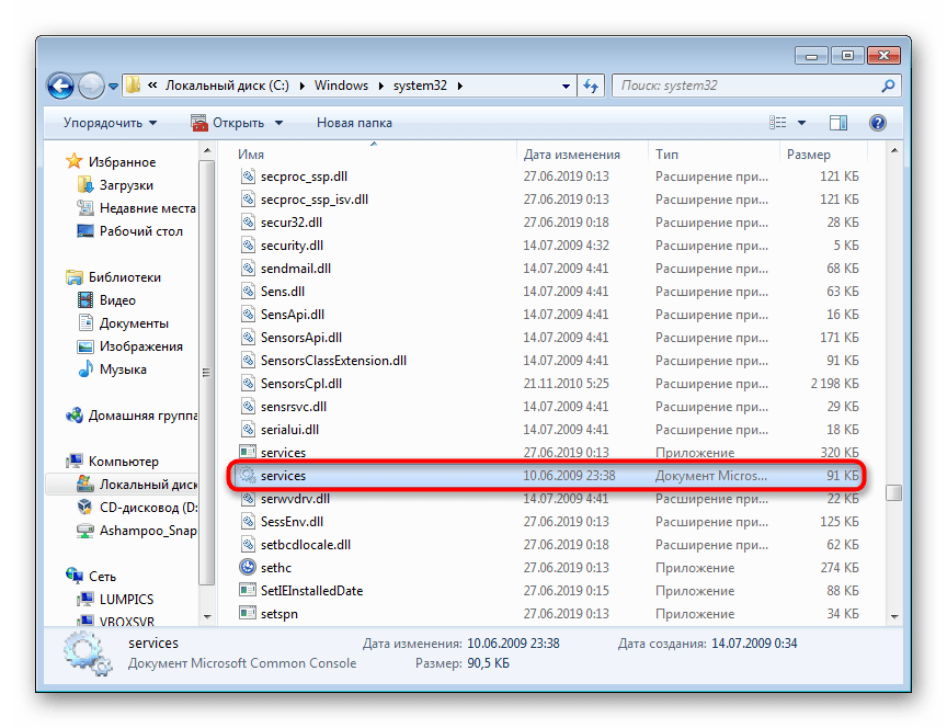 Осуществить запуск можно и найдя программу в одной из системных папок на компьютере. По умолчанию «Службы», как и многие другие стандартные утилиты Windows, располагаются здесь: C:WindowsSystem32. Отыщите приложение «services» и откройте его. В списке может быть два файла с одинаковым названием, запускать нужно тот, что имеет логотип в виде шестеренок.