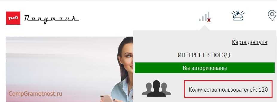 Как это сделать? На главной странице портала РЖД есть значок Wi-Fi (1 на рис. 18). Кликнем по нему. Сразу же увидим, ниспадающее окошко с надписью «Интернет в поезде». А под ней: информация о нашей авторизации, а также количество подключенных пользователей. Их на момент нашего теста, ни много ни мало 120 человек.