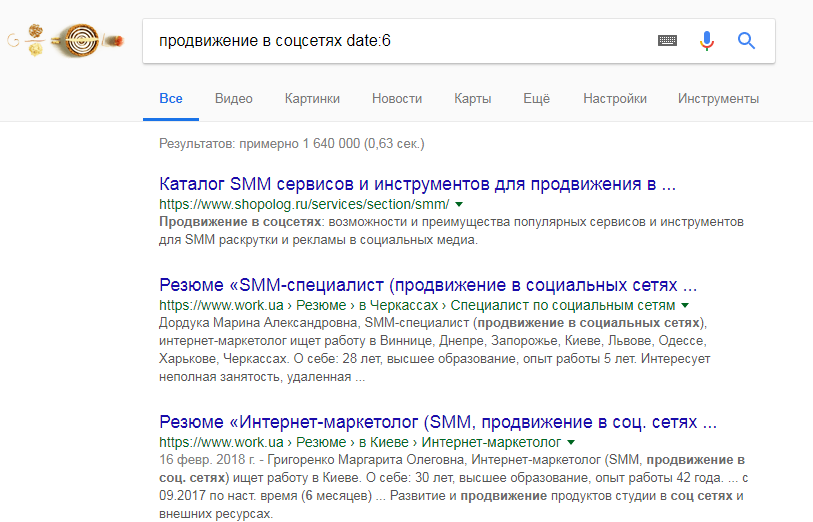 В выдаче появляется информация, которая была добавлена в индекс на протяжении последнего времени. Фраза вводится перед оператором, а после двоеточия без пробела необходимо поставить время, за которое будет показана информация. Временные рамки определяются в месяцах.