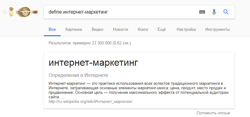 Вводимый термин обеспечивает поиск информации по одному из авторитетных источников по мнению Google. Фразу необходимо вводить после двоеточия без пробела.