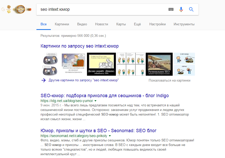 Использование команды «seo intext:юмор» обеспечивает выдачу по слову “юмор”, но результаты при этом будут содержать материалы связанные с SEO.