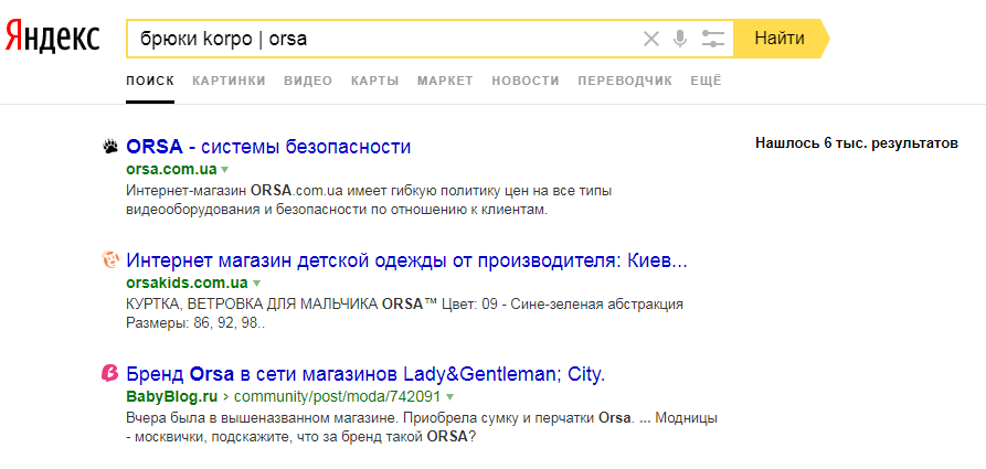 Позволяет искать между двумя и более словами одновременно. Как пример стоит отметить ключ «брюки korpo | orsa», после чего система осуществит поиск между двумя брендами.