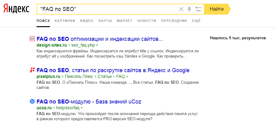 Функция обеспечивает поиск страниц, на которых имеется ключ в точном соответствии. Примером является фраза «FAQ по SEO», ответом на которую является информация с точным совпадением.