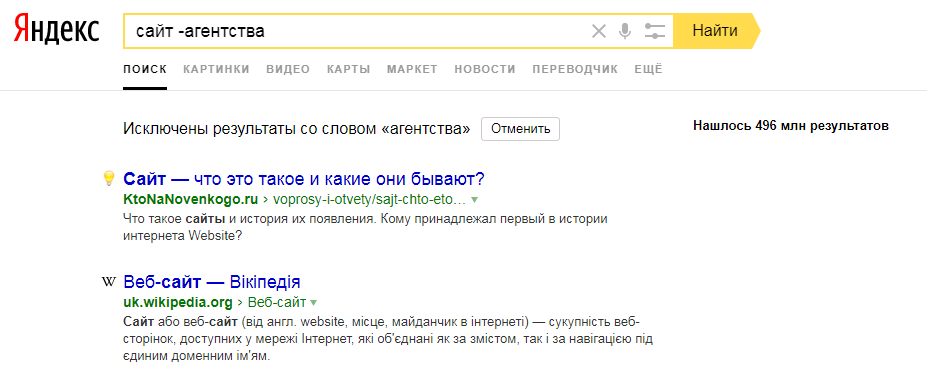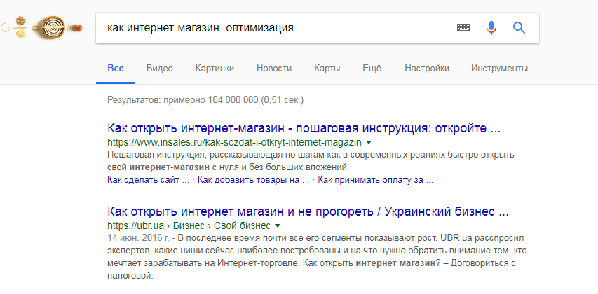 2. – (минус) – в противоположность предыдущему варианту применим, если нужно исключить слово или предлог из запроса.