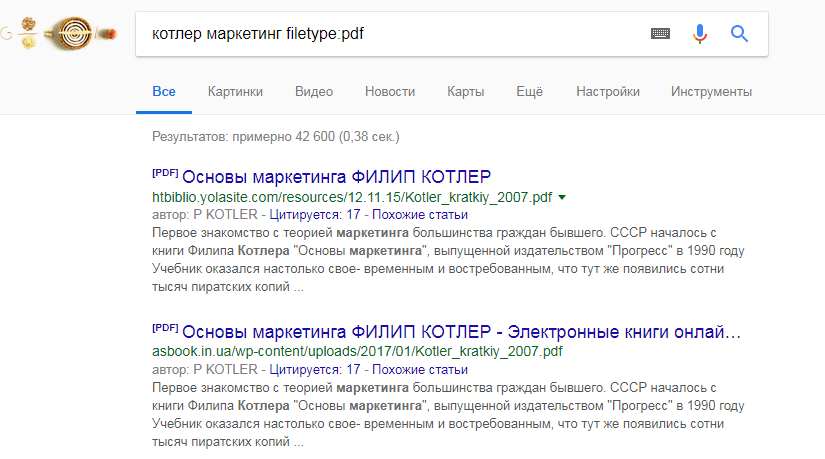 Данный специальный символ позволяет найти в интернете документы указанного типа, что в разы экономит время. Яркий пример – это необходимость найти книгу в формате PDF, где команда выглядит следующим образом: «название книги filetype:pdf».