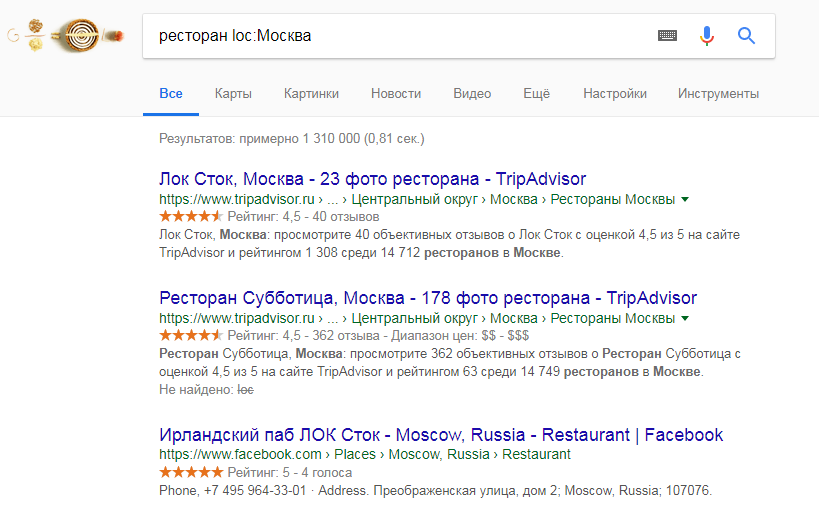 Позволяет получить выдачу по определенному запросу при условии учета определенного местоположения, которое указывается после двоеточия без пробела.
