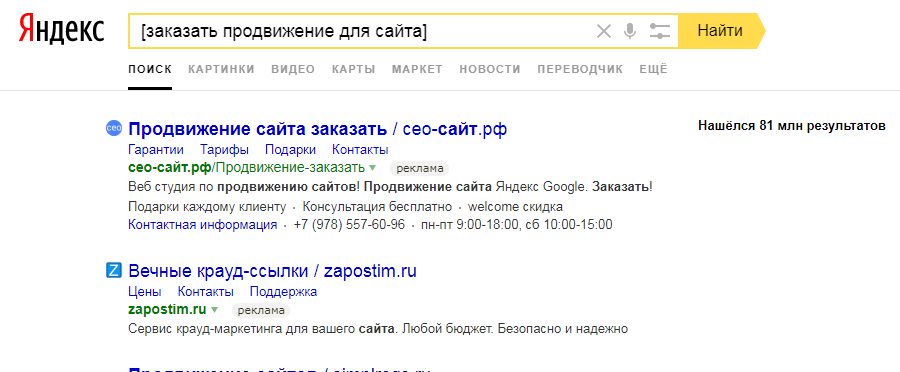 5. [] (квадратные скобки) – оператор позволяет сохранить точный порядок слов в запросе, при этом словоформы могут изменяться.
