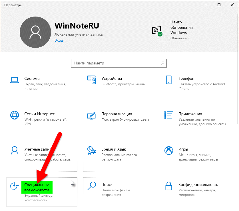 В открывшемся окне «Параметры» выберите Специальные возможности .