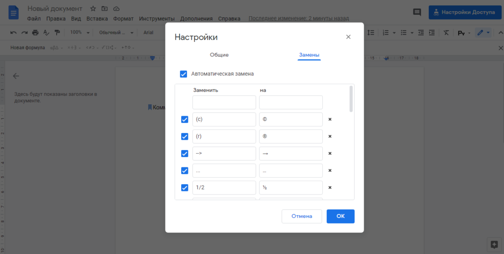 В Гугл Документах отсутствуют кавычки-елочки — здесь может выручить автозамена. Активировать этот сервис также можно через раздел «Инструменты» — «Настройки» — «Замены». С его помощью на место одних знаков подставляются другие. В открывшемся окошке с левой стороны будут представлены символы в исходном виде, а с правой стороны те, что будут их заменять. По умолчанию в редактор уже встроены некоторые символы, которые при необходимости можно изменить.