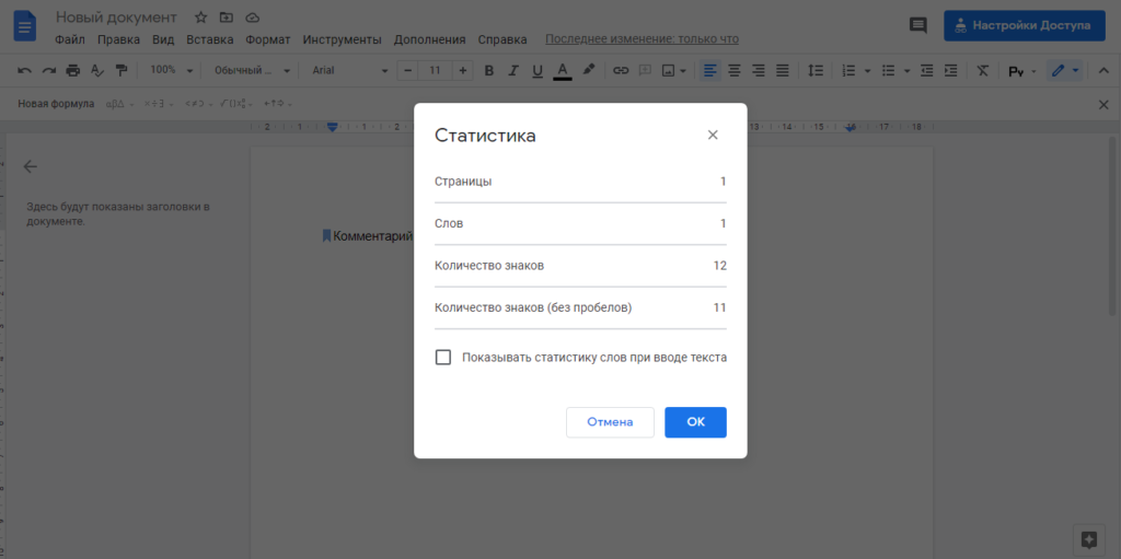 Один из наиболее популярных инструментов у копирайтеров. С его помощью можно получить краткую информационную сводку о документе: число символов, страниц и слов. Просмотреть статистику можно через «Инструменты» или с помощью комбинации Ctrl+Shift+C.