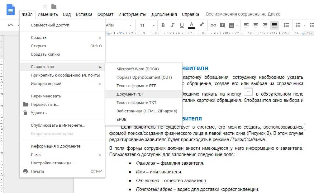 Скачать как — позволяет скачать открытый документ как файл на компьютере в любом выбранном формате. Это значит, что с ним можно будет работать как и с обычным файлом в любой другой программе: