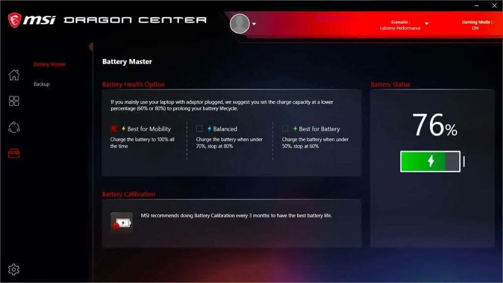 Пользователи MSI могут использовать приложения Dragon Center или Creator Center (в зависимости от типа ноутбука), чтобы установить пороговое значение заряда батареи. Выберите значок панели инструментов в левой части приложения. В разделе «Параметры состояния батареи» вы увидите три варианта.