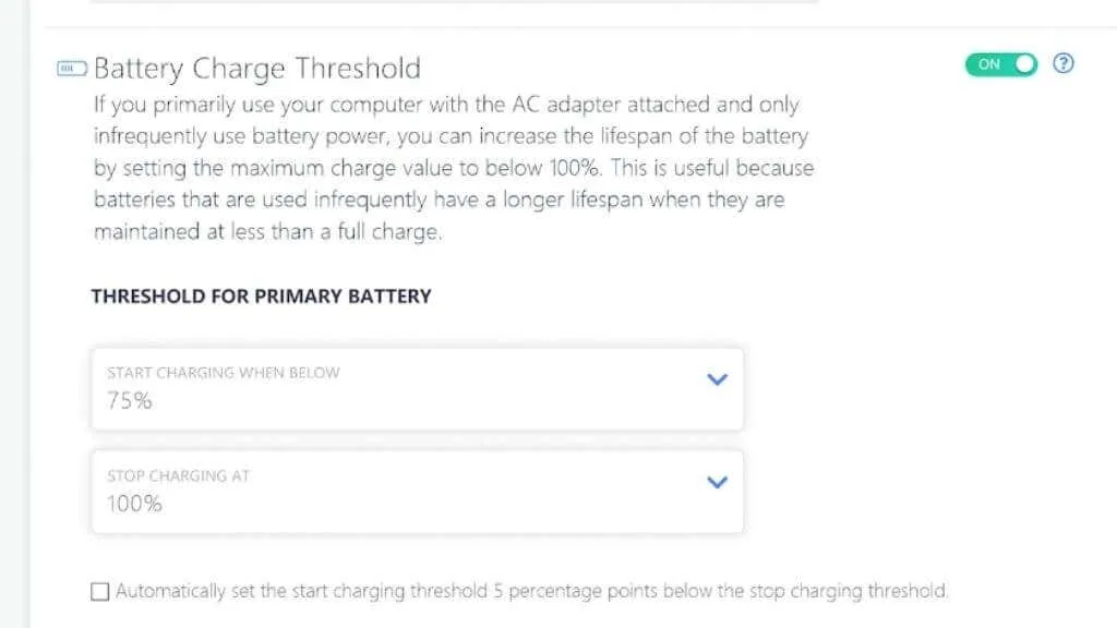 Если ваш ноутбук поддерживает порог зарядки, вы, скорее всего, найдете ручную настройку в меню UEFI (замена старой технологии BIOS). Поскольку доступ к нему неудобен, многие производители ноутбуков предлагают собственное приложение для переключения этих настроек на уровне оборудования без перезагрузки системы.