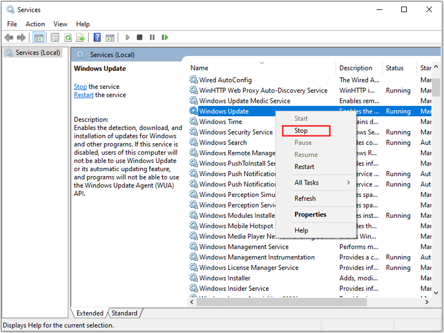 Step 2: Locate Windows Update service. Right-click the service and choose Stop to disable it temporarily. Then, exit the window.