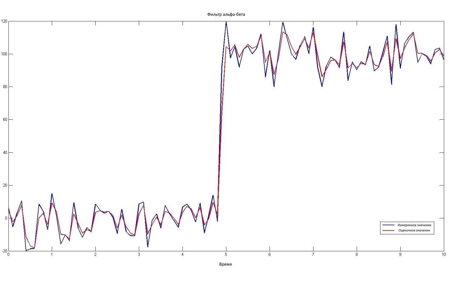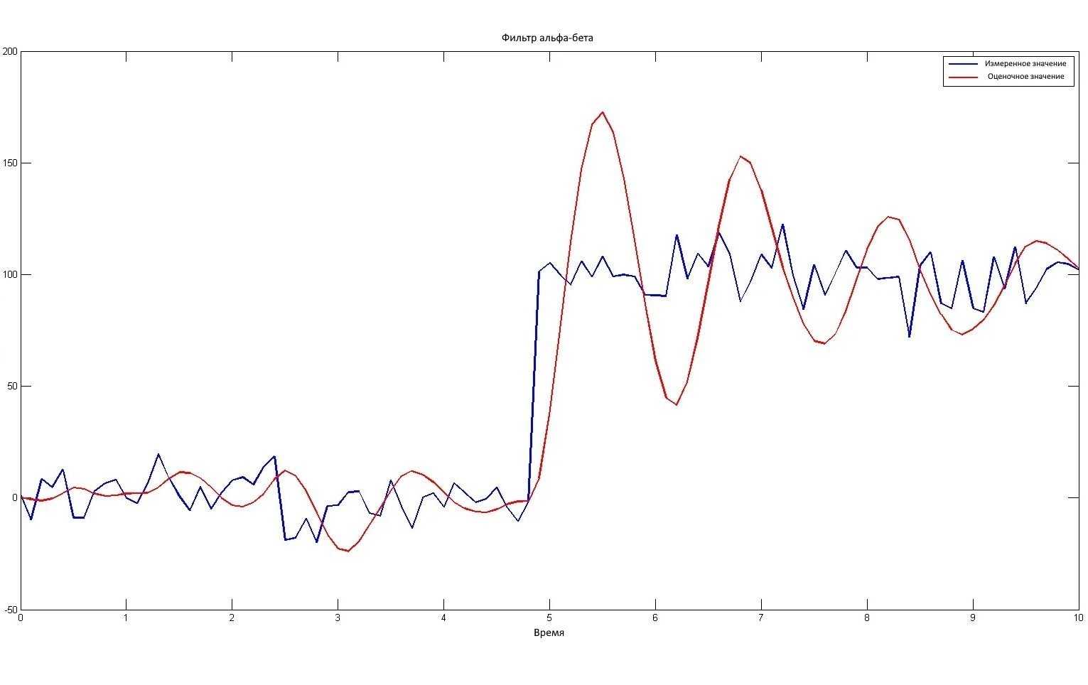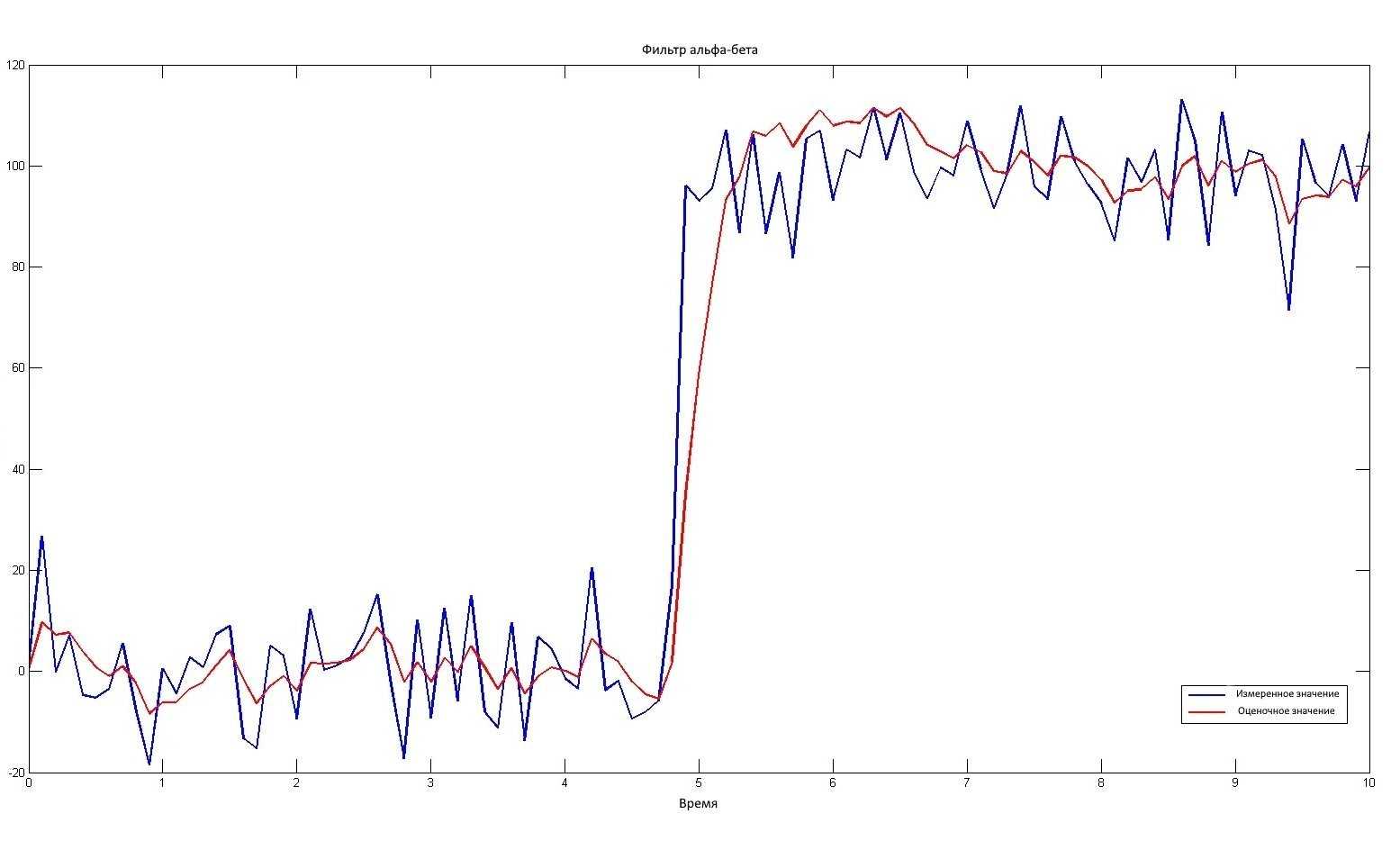 Алгоритм делится на этап прогнозирования следующего состояния (первые два уравнения) и корректировку прогнозируемого значения на основе измерения (следующие два уравнения). Параметры альфа и бета используются для настройки фильтра. Их значения следует менять в диапазоне от 0 до 1.