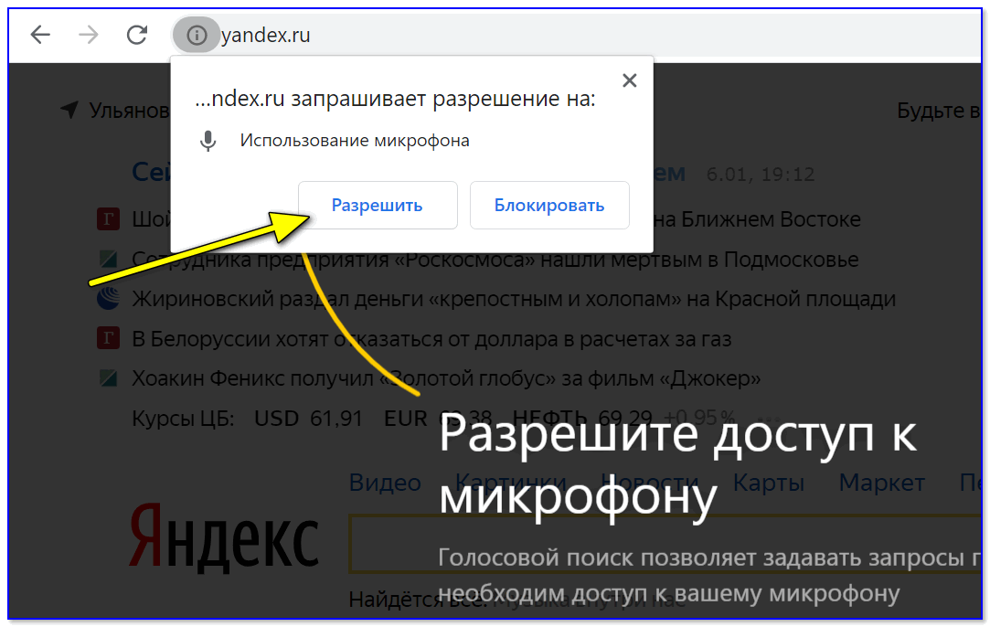 В целях безопасности браузер блокирует доступ к определенным устройствам, таким как камера или микрофон. Может случиться такое, что ограничение коснется и страницы с голосовым поиском. В таком случае у вас отобразится специальное уведомление при попытке выполнить голосовую команду, где нужно будет переставить точку на «Всегда предоставлять доступ к моему микрофону».