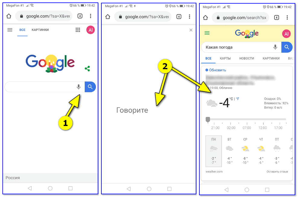 После вы сможете произнести нужный запрос, например, «погода на сегодня» или «сайт с рецептами».