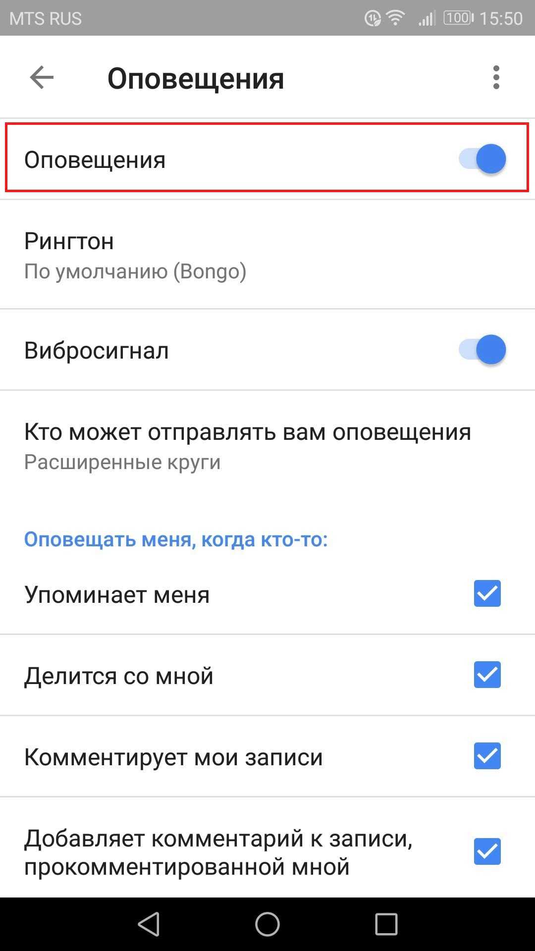 Есть несколько различных вариантов уведомлений в этом меню, но мы начнем с самого верха. Первый вариант в этом меню «Кто может отправлять вам оповещения». Есть несколько вариантов (по умолчанию установлено «Расширенные круги»), поэтому можете выбрать то, что лучше подходит для Вас. Если Вы планируете полностью отключить уведомления, то здесь не нужно ничего настраивать — мы сделаем это ниже.