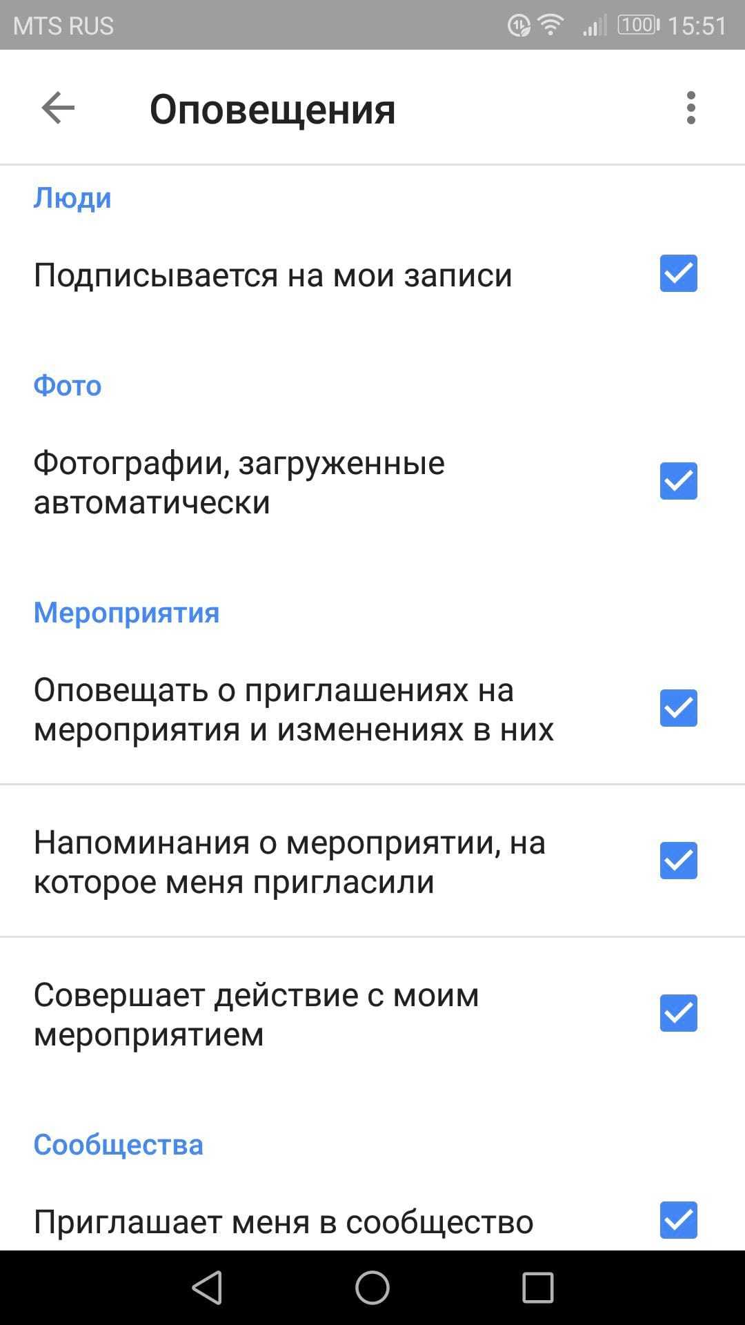 Но вот в чем дело: это просто общие настройки. Если Вам необходимо более тонкая настройка, то нажмите на стрелку рядом с каждым подразделом (записи, люди, фото и т.д.) для глубокой настройки уведомлений.