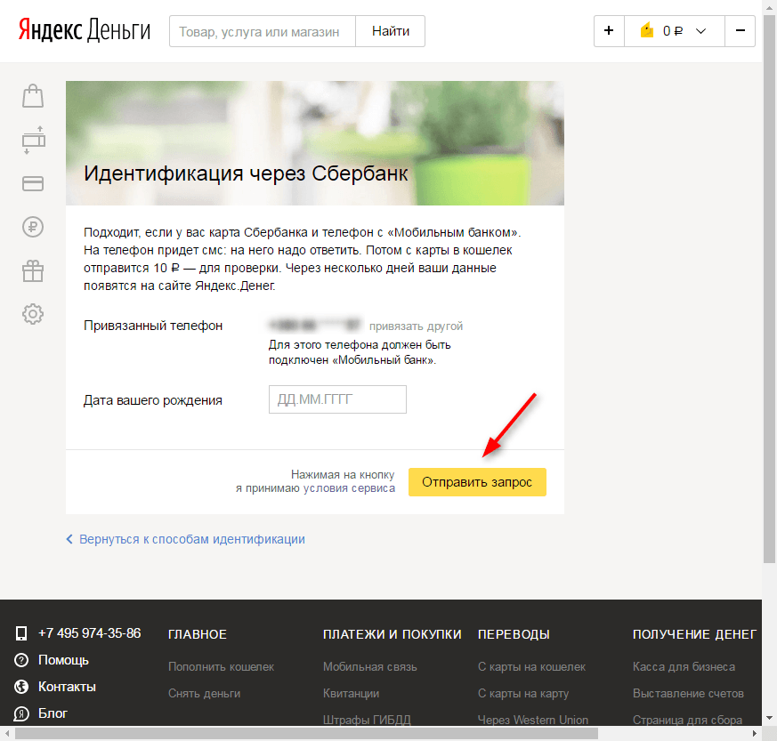 Подтвердите свой номер телефона и введите дату рождения, после чего нажмите «Отправить запрос». Затем нужно ответить на смс, которое придет от банка. С вашей карты на кошелек Яндекс Денег будут переведены 10 рублей для проверки. Через несколько дней ваши данные появятся на сервисе Яндекс Деньги. Эта процедура является бесплатной.