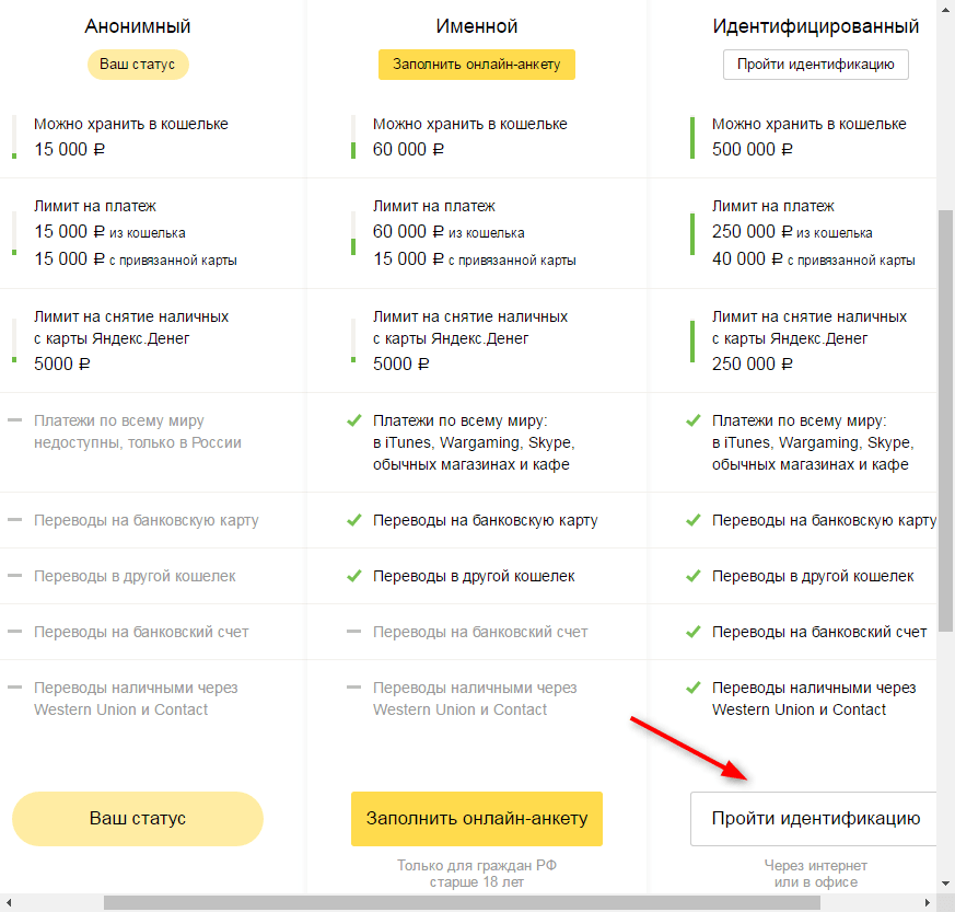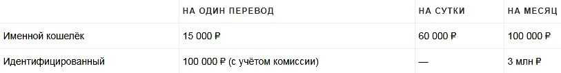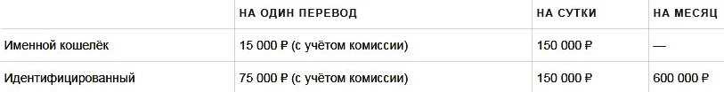 Идентификация снимает все ограничения. Теперь максимальная сумма средств для хранения увеличена до 500 тысяч, лимит напрямую с кошелька до 250 тысяч рублей, а с карты до 100 тысяч.