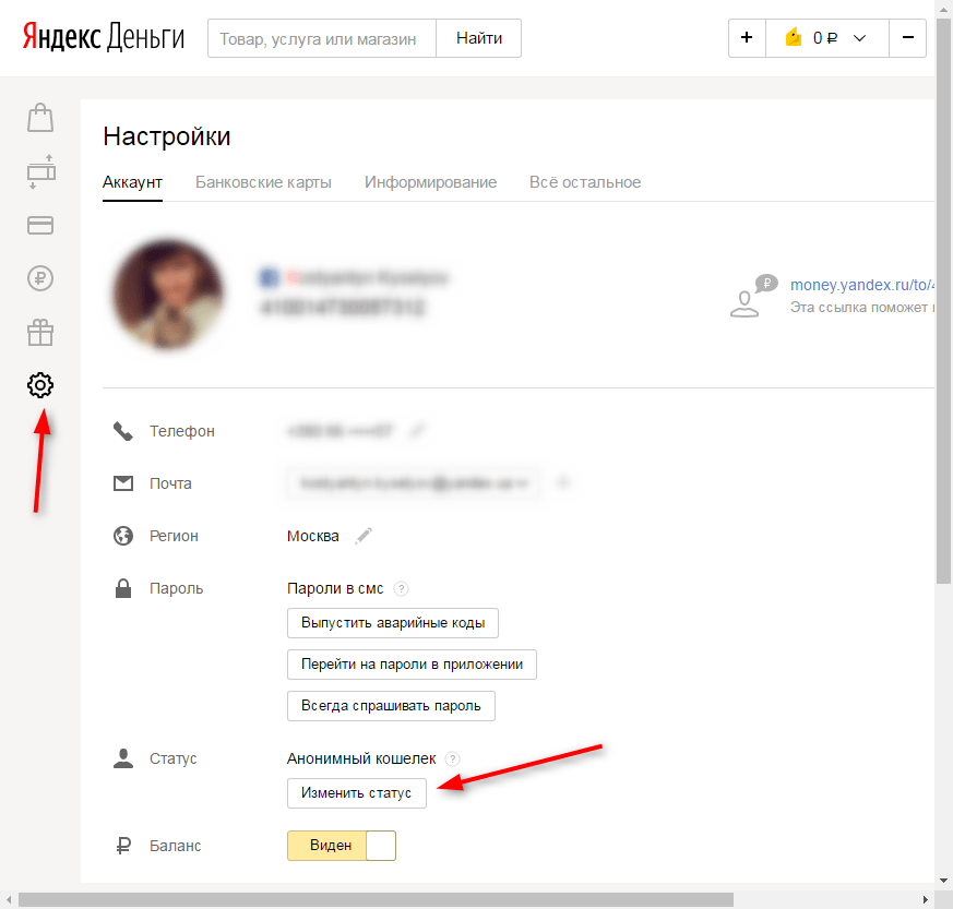 Зайдите в панель настроек с главной страницы Яндекс Денег. Нажмите кнопку «Изменить статус».